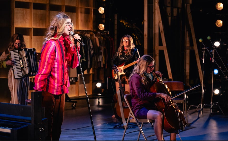 Where this show really shines though, is in the music and the performances. Vocally, this is one of the best sounding shows I’ve ever seen in Philadelphia. The first time the ensemble sings as one, the wall of sound that is created is breathtaking. Alex Bechtel’s arrangements and music direction truly shine, leaving this critic desperately wanting them to release a recording of these songs with this cast. The performers are also accompanying themselves, which is impressive in its own right, never mind the truly splendid execution of staging while playing. At the heart of this ensemble piece is a truly magnetic performance by Dito van Reigersberg. From the moment they walk onto the stage, and take up the blonde ombre wig, they are instantly captivating. In a show that is positing ideas about artifice and illusion in Hollywood, their performance is so brazenly open and honest, that it strips away all artifice and stands in direct opposition to the harsh ideas the show is exploring, to masterful effect.