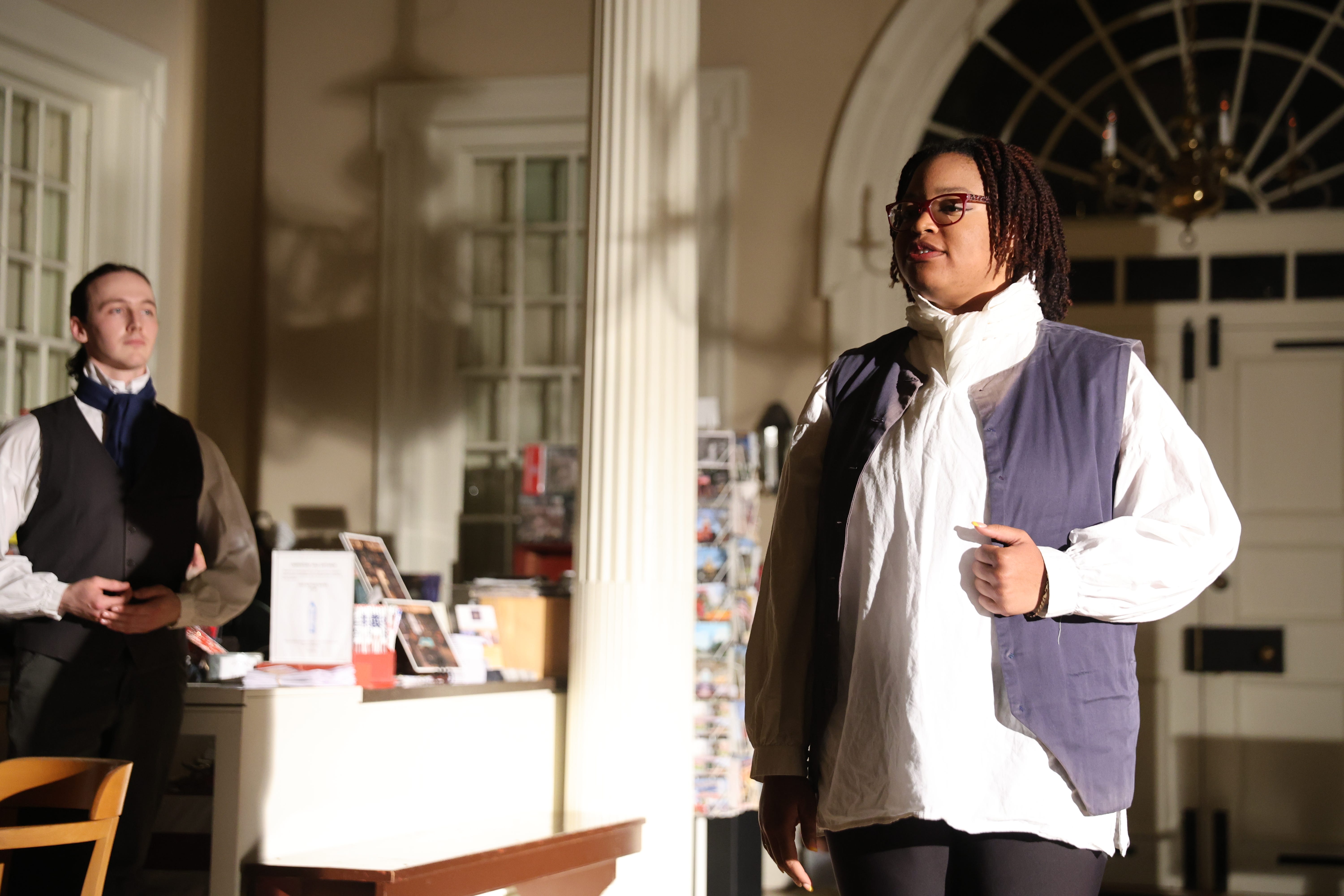 The recast at the center of this show within a show is the role of Thomas Jefferson. Originally played by a white actor, the production team decides to bump up Hannah, a black woman, who was already playing Samuel Adams, to now play Thomas Jefferson, when the original actor breaks their leg...literally. This could of course be a fascinating casting choice, standing in sharp juxtaposition and contrast with what is historically known about Jefferson, and his very sordid participation in slavery. This could be a central theme of the show, and explore the complicated feelings of a black woman inhabiting the role of a man who was a noted slave owner. Confoundingly, these ideas are barely referenced in this piece, which remains shockingly unsure of what it wants to say about the subject matter.
